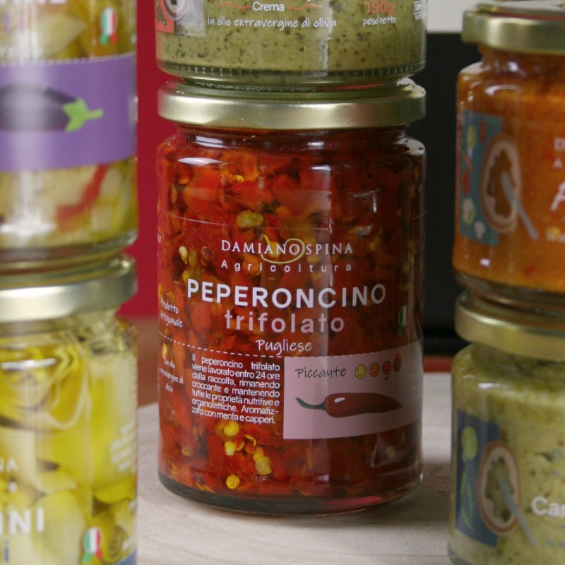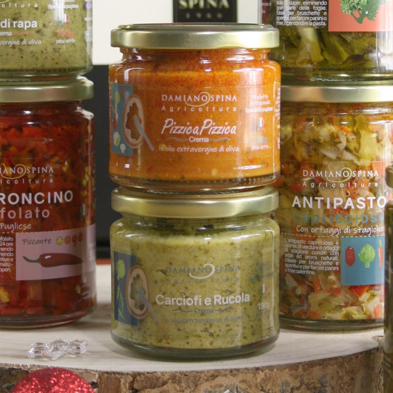 Melanzane a filetti 330 g, Carciofini spaccati 330 g Crema cime di rapa 190 g Peperoncino Trifolato 330 g Crema pizzica pizzica 190 g Crema Carciofi e Rucola 190 g Cime di rapa 330 g Funghi Cardoncelli 330 g Antipasto Capriccioso 330 g